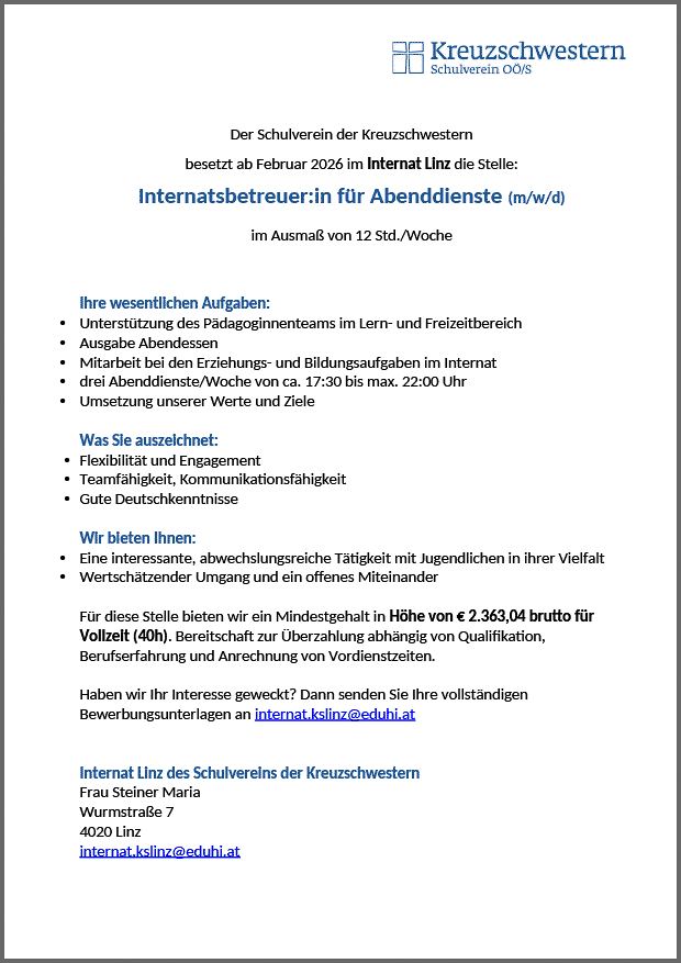 Internatsbetreuer:in für Abenddienste (m/w/d) Internat Linz, 12 Std./Woche Internatsbetreuer:in für Abenddienste (m/w/d): Internatsbetreuer:in für Abenddienste (m/w/d)