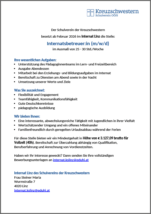 Internatsbetreuer:in (m/w/d) Internat Linz, 25 - 30 Std./Woche Internatsbetreuer:in (m/w/d): Internatsbetreuer:in (m/w/d)