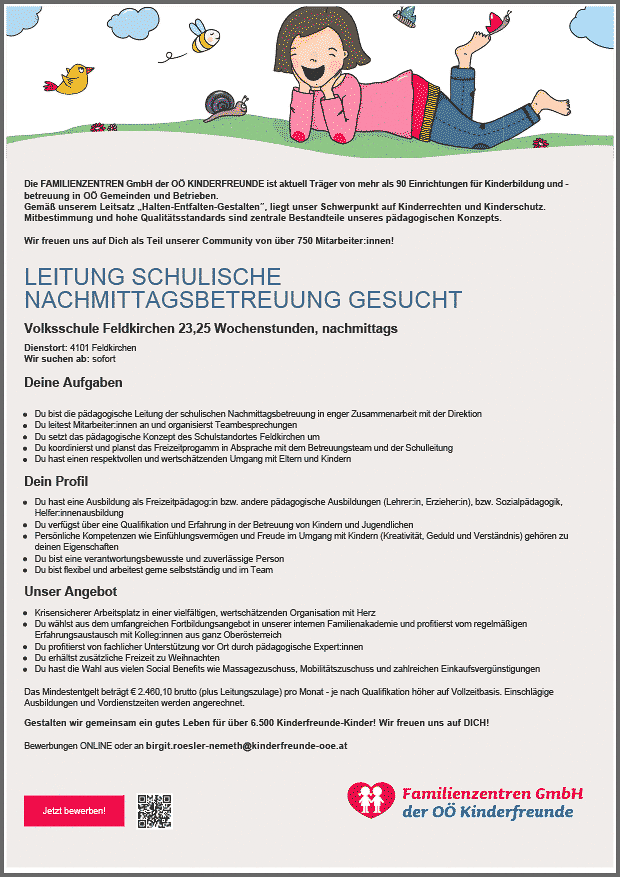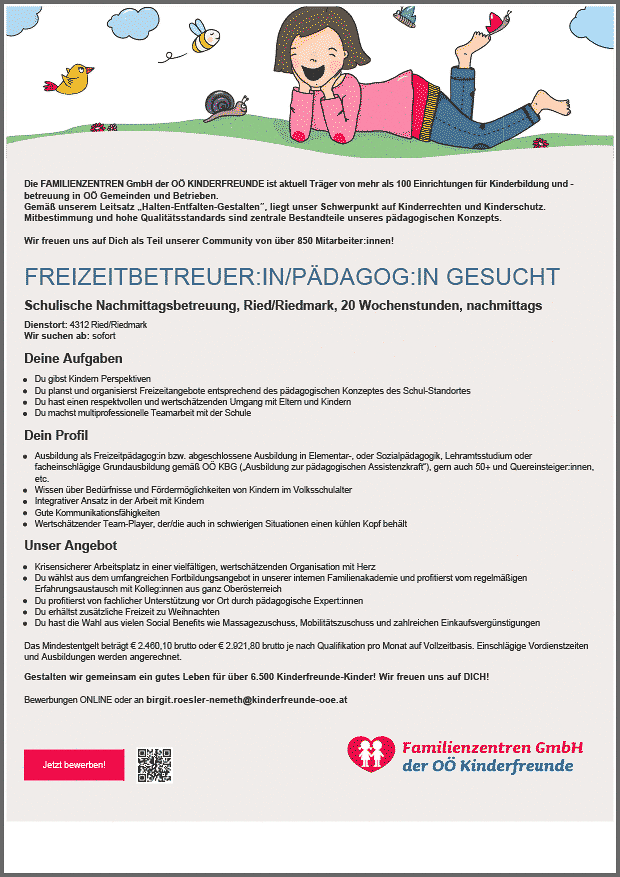 FREIZEITBETREUER:IN/PÄDAGOG:IN Schulische Nachmittagsbetreuung, Ried/Riedmark, 20 Wochenstunden FREIZEITBETREUER:IN/PÄDAGOG:IN: FREIZEITBETREUER:IN/PÄDAGOG:IN