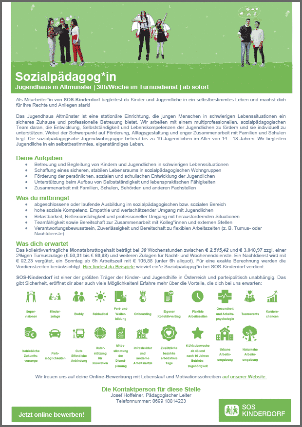 FREIZEITBETREUER:IN/PÄDAGOG:IN SCHULISCHE NACHMITTAGSBETREUUNG Schulische Nachmittagsbetreuung Molln, 20 Wochenstunden FREIZEITBETREUER:IN/PÄDAGOG:IN SCHULISCHE NACHMITTAGSBETREUUNG: FREIZEITBETREUER:IN/PÄDAGOG:IN SCHULISCHE NACHMITTAGSBETREUUNG