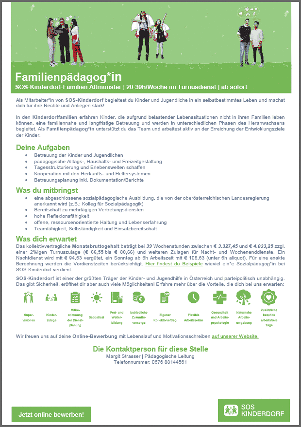Familienpädagog*in SOS Kinderdorf Familien Altmünster | 20-39h/Woche Familienpädagog*in: Familienpädagog*in
