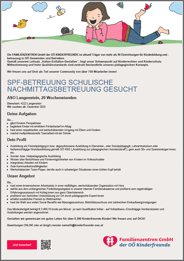 Schulische Nachmittagsbetreuung, Vöcklabruck SIMS, ca. 14 Wochenstunden