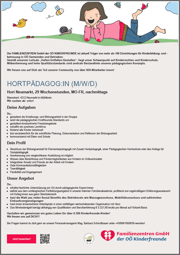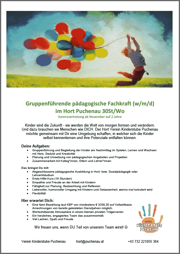 FREIZEITBETREUER:IN/PÄDAGOG:IN Schulische Nachmittagsbetreuung Langenstein VS, Krankenstandsvertretung ab sofort, 20 Wochenstunden