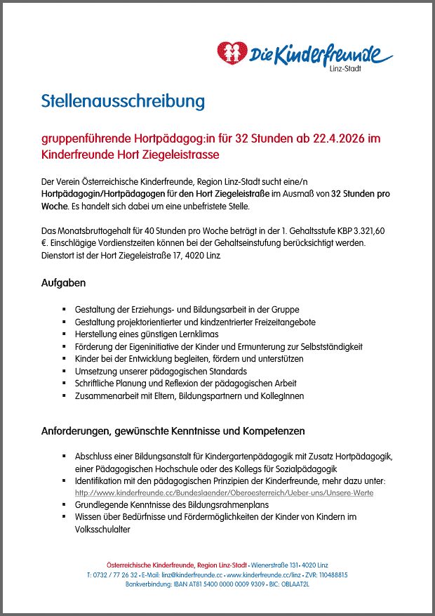 gruppenführende Hortpädagog:in für 32 Stunden, Hort Ziegeleistrasse Linz gruppenführende Hortpädagog:in: gruppenführende Hortpädagog:in