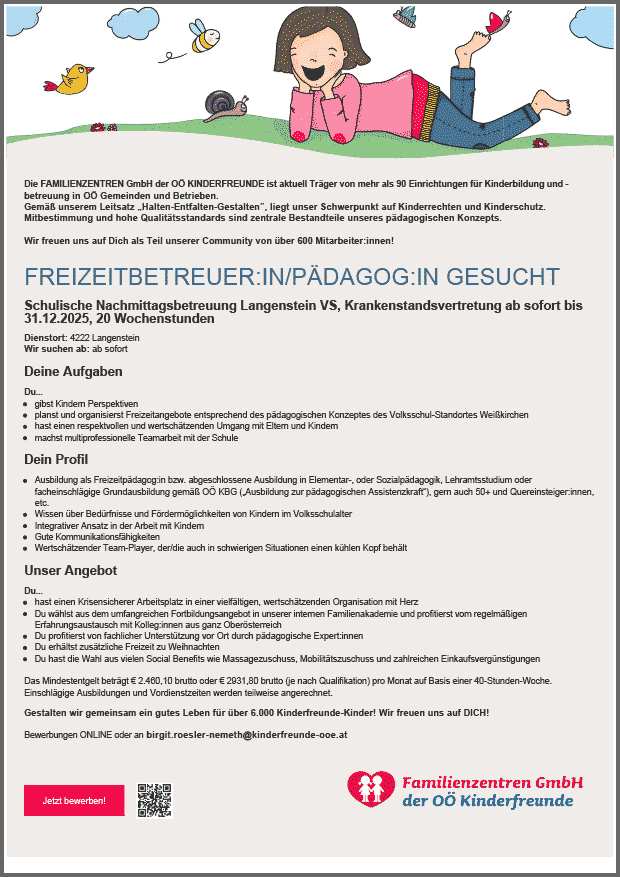 FREIZEITBETREUER:IN/PÄDAGOG:IN Schulische Nachmittagsbetreuung Langenstein VS, Krankenstandsvertretung ab sofort bis 31.12.2025, 20 Wochenstunden
