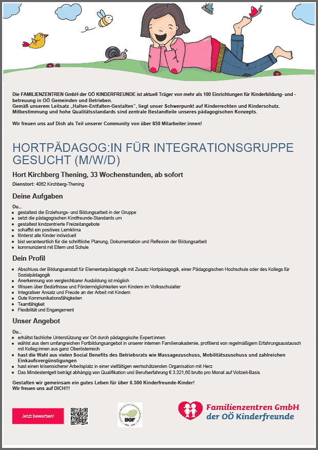 HORTPÄDAGOG:IN FÜR INTEGRATIONSGRUPPE (M/W/D) Hort Kirchberg Thening, 33 Wochenstunden HORTPÄDAGOG:IN FÜR INTEGRATIONSGRUPPE (M/W/D): HORTPÄDAGOG:IN FÜR INTEGRATIONSGRUPPE (M/W/D)