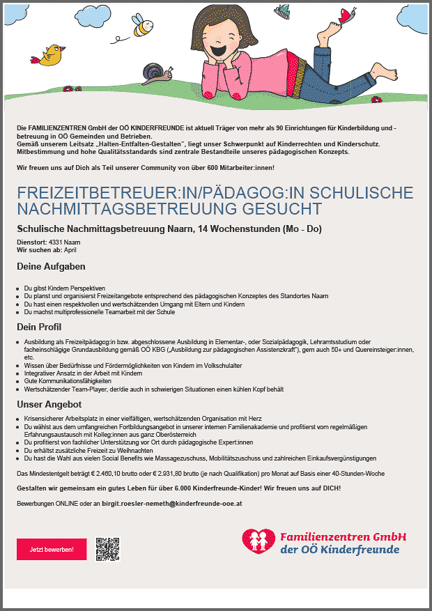 FREIZEITBETREUER:IN/PÄDAGOG:IN Schulische Nachmittagsbetreuung Naarn, 14 Wochenstunden, Naarn FREIZEITBETREUER:IN/PÄDAGOG:IN: FREIZEITBETREUER:IN/PÄDAGOG:IN