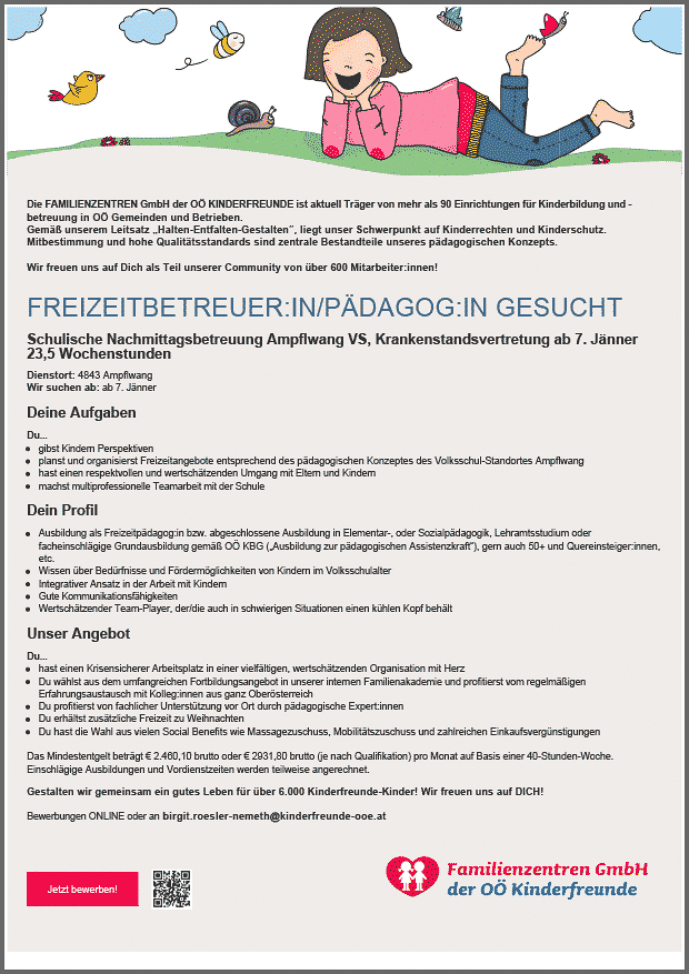 FREIZEITBETREUER:IN/PÄDAGOG:IN Nachmittagsbetreuung Ampflwang VS, 23,5 Wochenstunden FREIZEITBETREUER:IN/PÄDAGOG:IN: FREIZEITBETREUER:IN/PÄDAGOG:IN