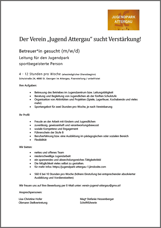 Betreuer*in gesucht (m/w/d) Leitung für den Jugendpark, 4 - 12 Stunden pro Woche, St. Georgen im Attergau