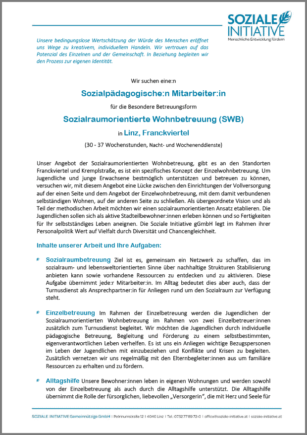 Sozialpädagogische:n Mitarbeiter:in Sozialraumorientierte Wohnbetreuung (SWB) in Linz, Franckviertel, 30 - 37 Wochenstunden, Nacht- und Wochenenddienste