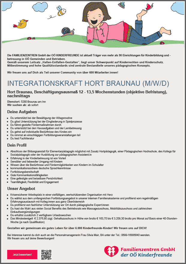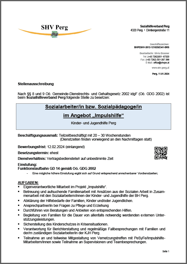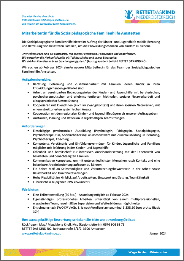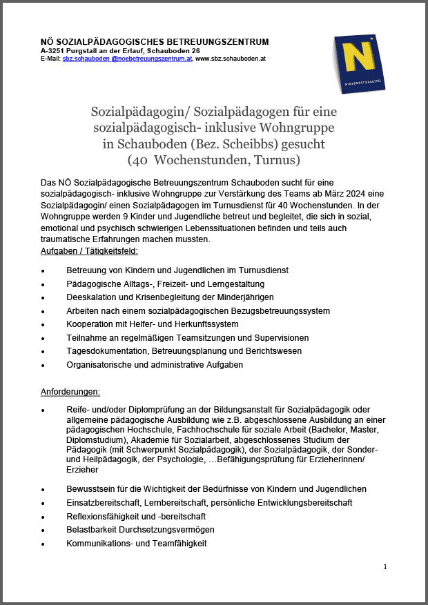 Sozialpädagogin/ Sozialpädagogen für eine sozialpädagogisch- inklusive Wohngruppe Betreuungszentrum Schauboden, 40 Wochenstunden, Turnus