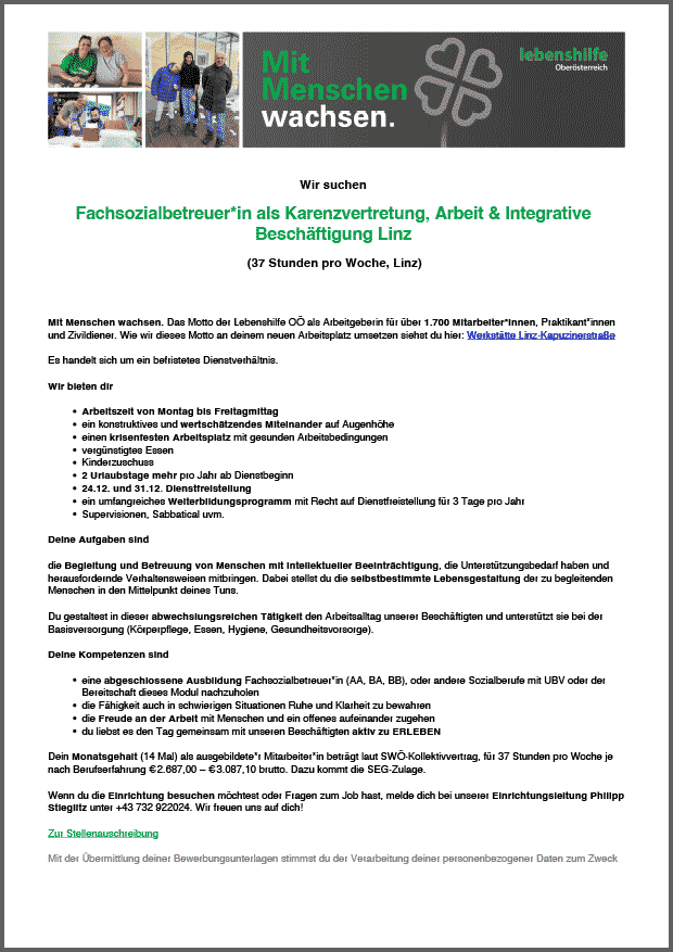 Fachsozialbetreuer*in als Karenzvertretung Arbeit & Integrative Beschäftigung Linz (37 Stunden pro Woche, Linz)