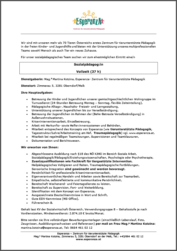 Sozialpädagog:in, Esperanza Zentrum für tierunterstützte Pädagogik