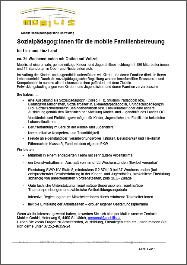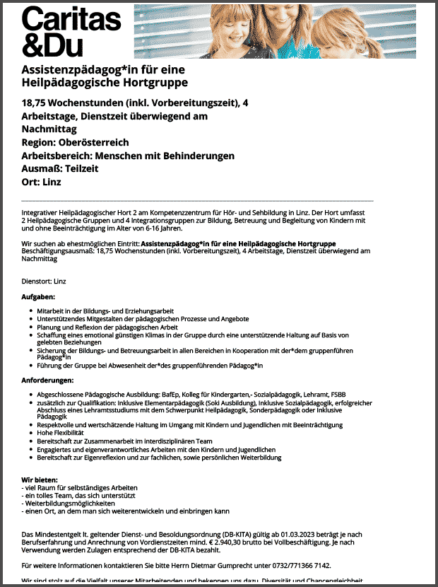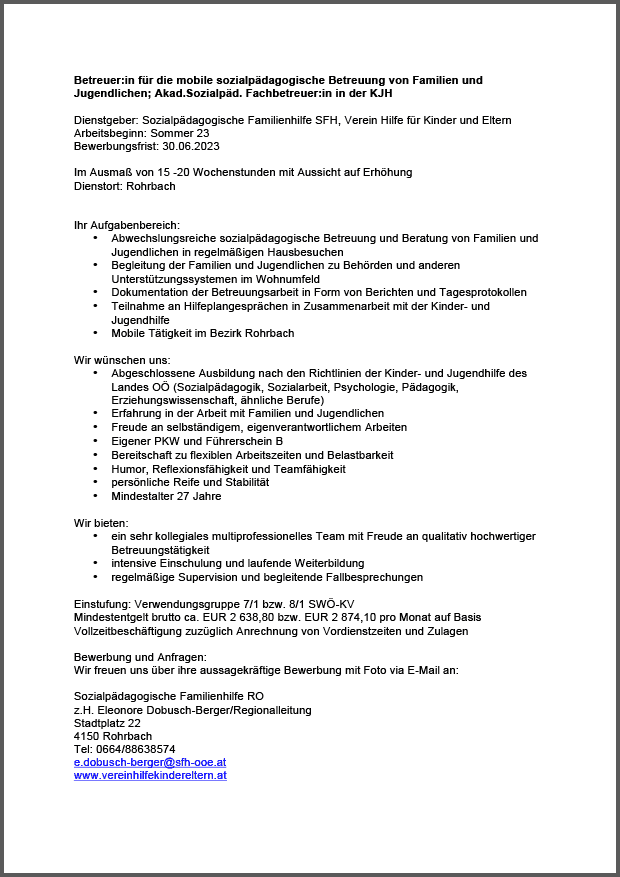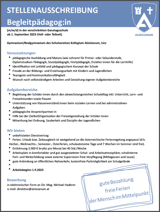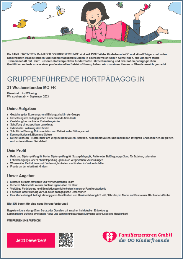 FREIZEITBETREUER:IN/PÄDAGOG:IN SCHULISCHE NACHMITTAGSBETREUUNG Volksschule Schwertberg, 15 Wochenstunden