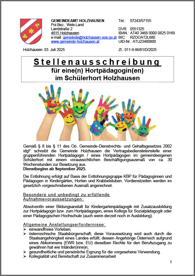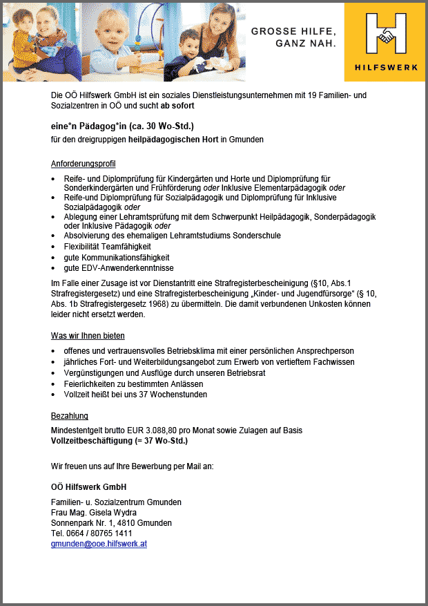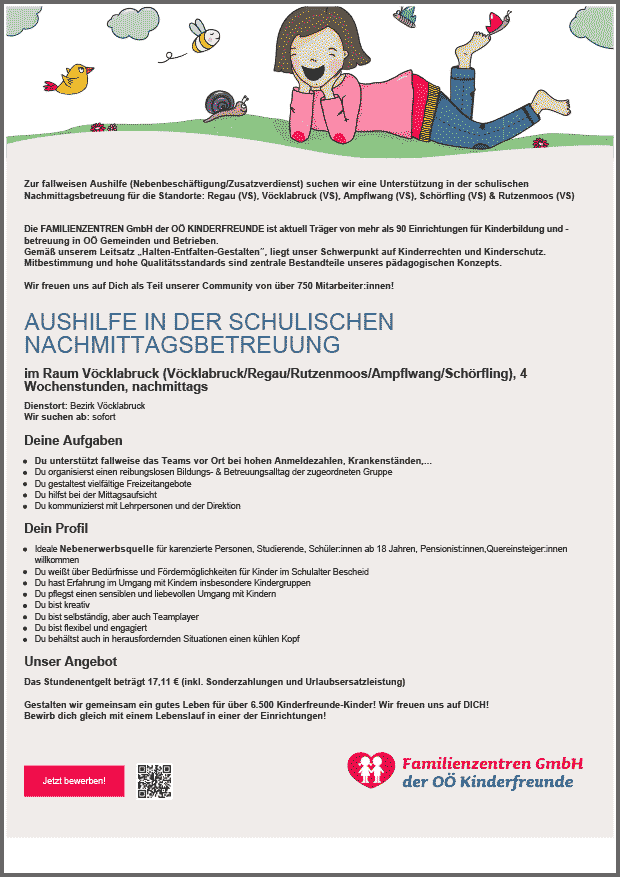 AUSHILFE IN DER SCHULISCHEN NACHMITTAGSBETREUUNG im Raum Vöcklabruck (Vöcklabruck/Regau/Rutzenmoos/Ampflwang/Schörfling), 4 Wochenstunden