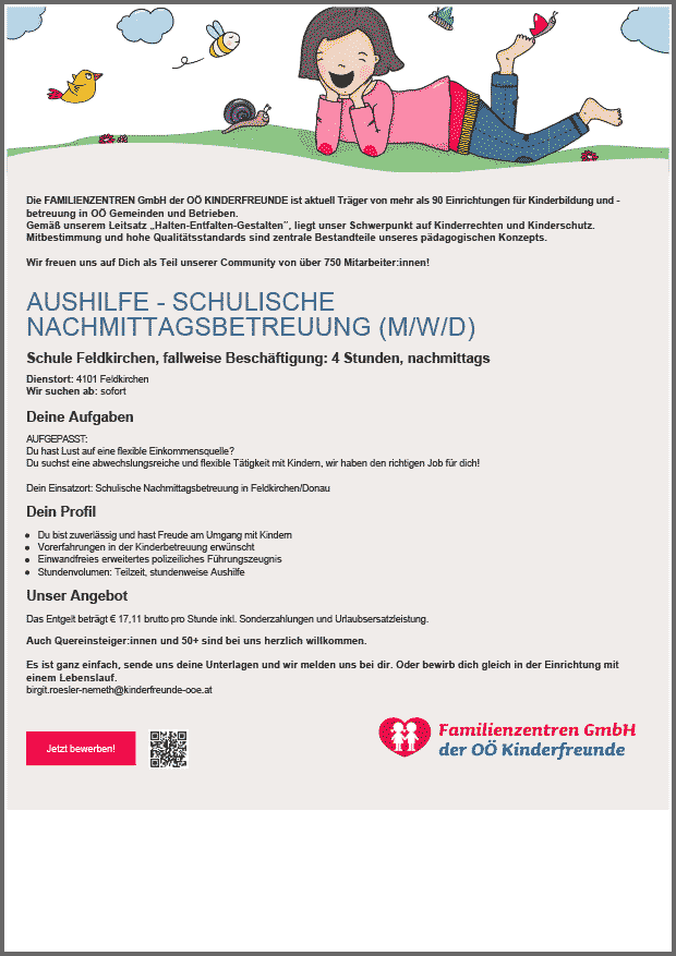 AUSHILFE - SCHULISCHE NACHMITTAGSBETREUUNG (M/W/D) Schule Feldkirchen, fallweise Beschäftigung: 4 Stunden