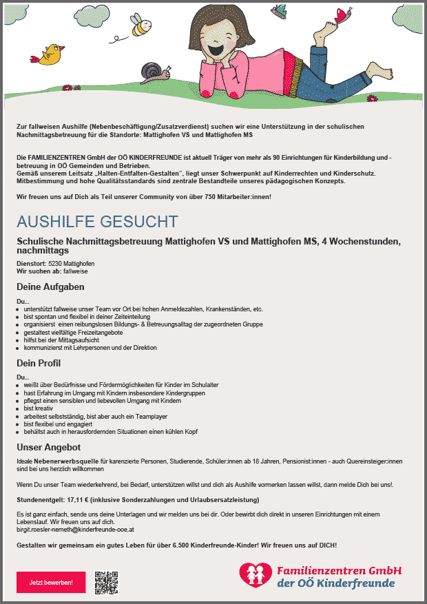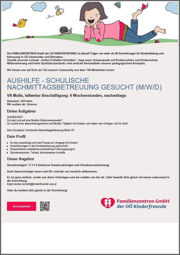 AUSHILFE - SCHULISCHE NACHMITTAGSBETREUUNG GESUCHT (M/W/D) VS Molln, fallweise Beschäftigung: 4 Wochenstunden