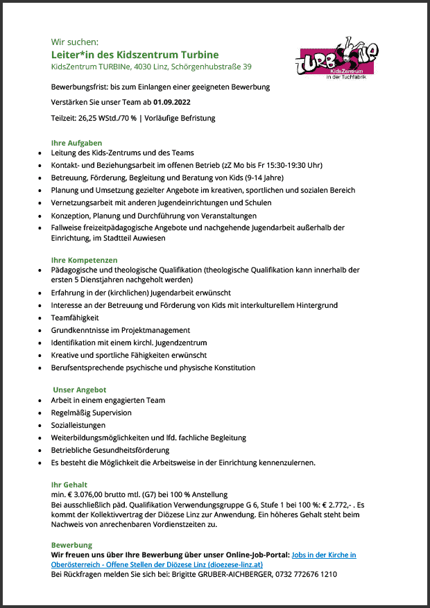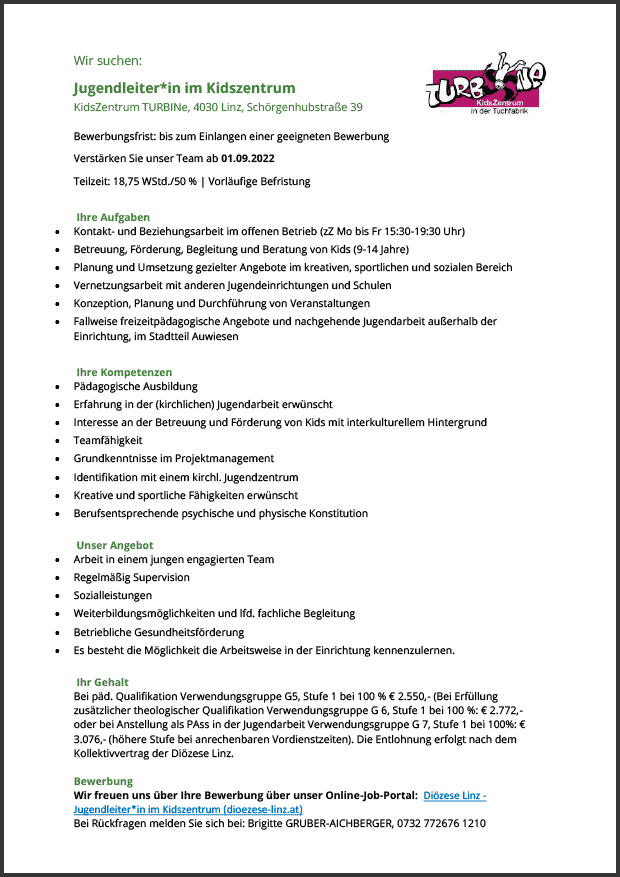 KidsZentrum TURBINe, 4030 Linz, 18,75 WStd.