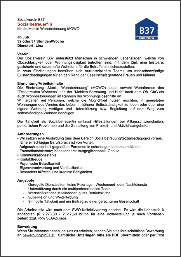 Mobile Wohnbetreuung MOWO Linz, 32 oder 37 Stunden/Woche