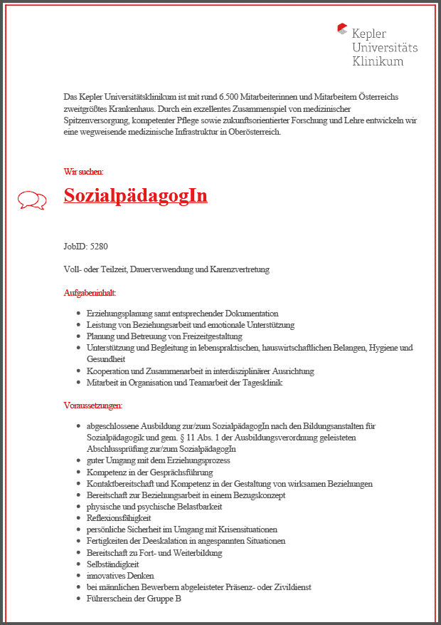 SozialpädagogIn Kepler Universitätsklinikum, Voll- oder Teilzeit, Dauerverwendung und Karenzvertretung