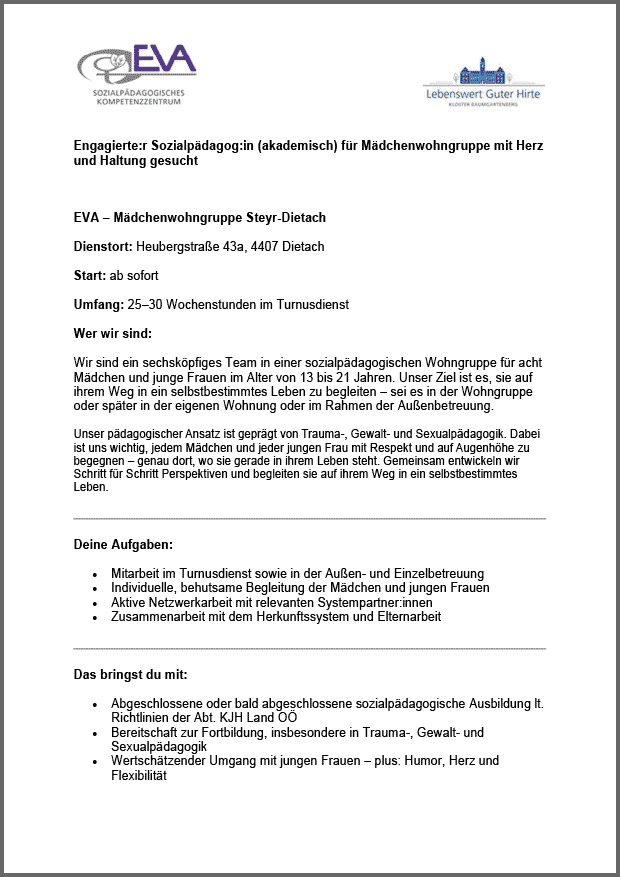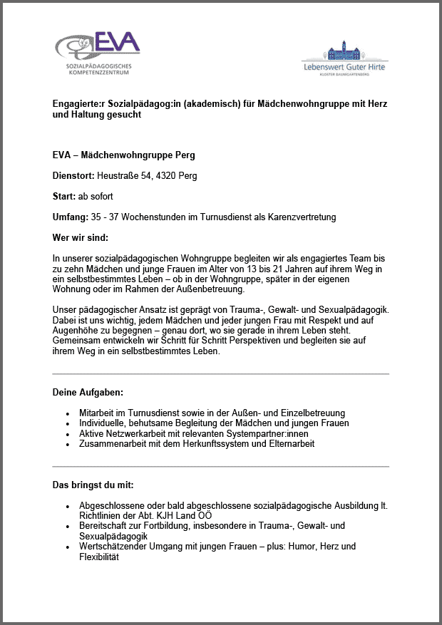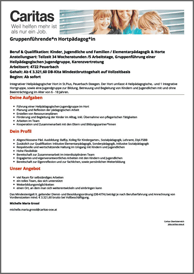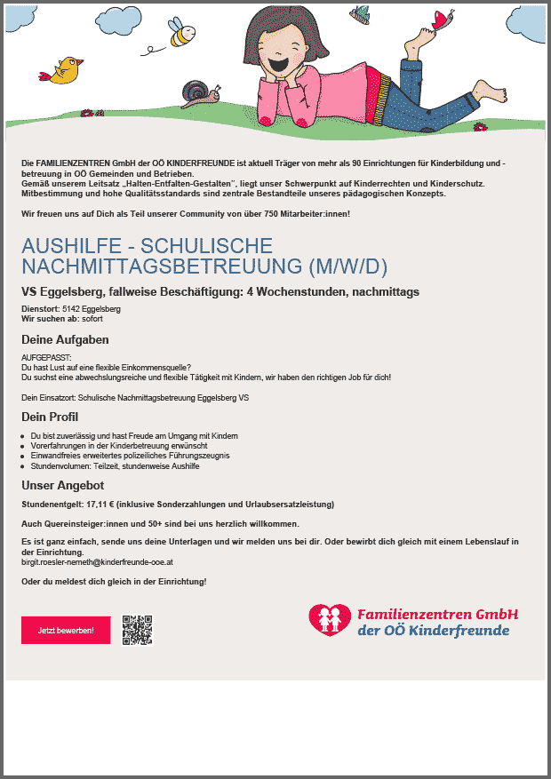 AUSHILFE - SCHULISCHE NACHMITTAGSBETREUUNG (M/W/D) VS Eggelsberg, fallweise Beschäftigung: 4 Wochenstunden