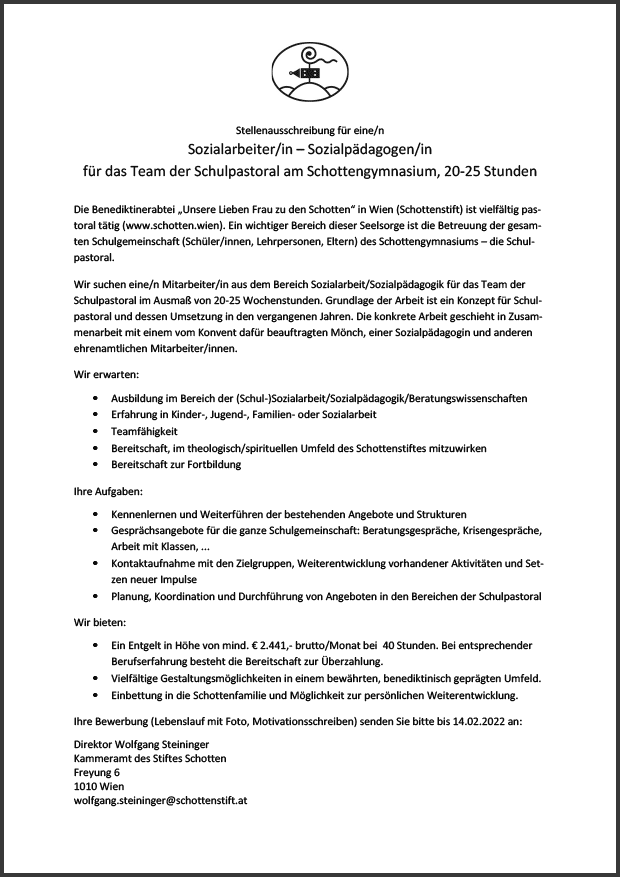Sozialarbeiter/in – Sozialpädagogen/in für das Team der Schulpastoral am Schottengymnasium 20-25 Stunden