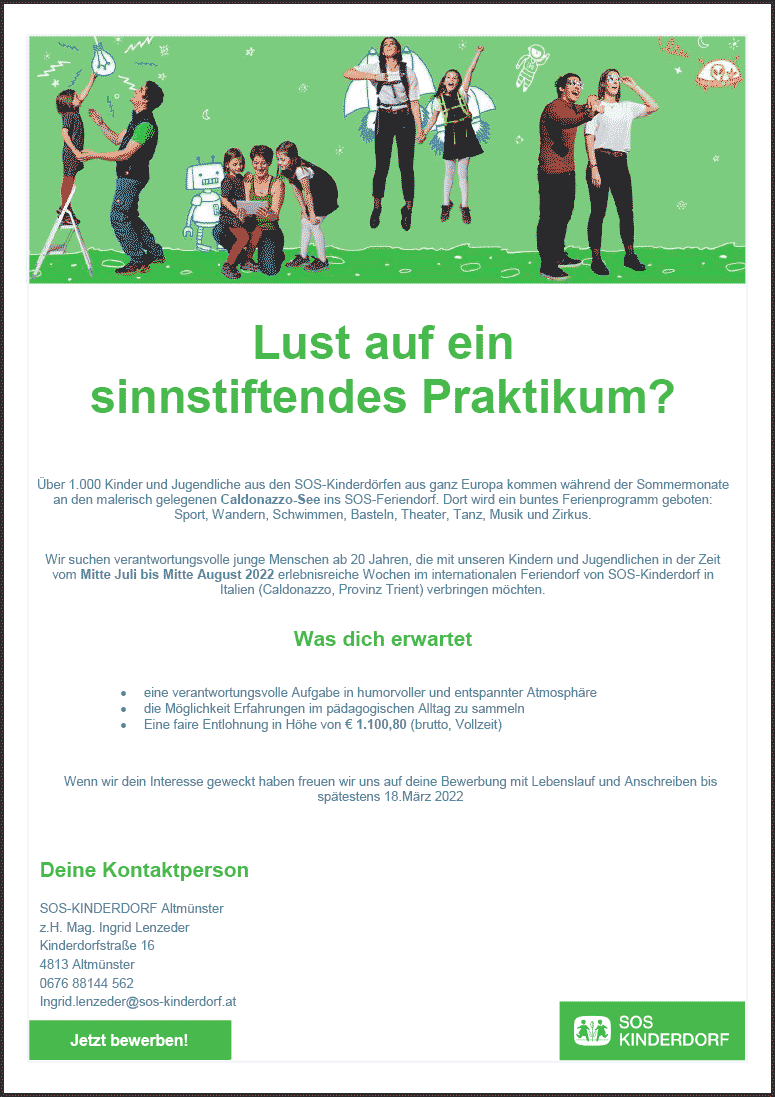 Praktikum Caldonazzo-See SOS-Feriendorf Dort wird ein buntes Ferienprogramm geboten: Sport, Wandern, Schwimmen, Basteln, Theater, Tanz, Musik und Zirkus.