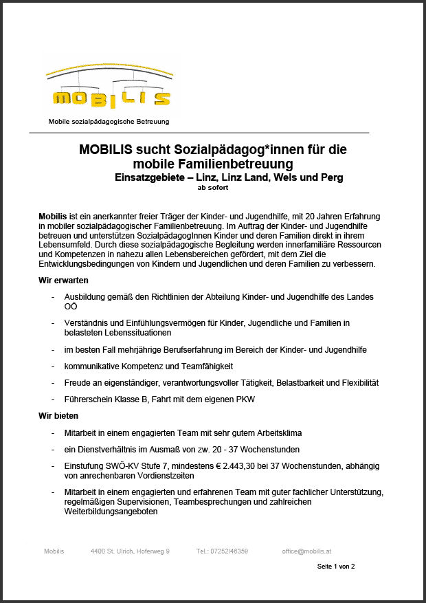 MOBILIS sucht Sozialpädagog*innen für die mobile Familienbetreuung Einsatzgebiete – Linz, Linz Land, Wels und Perg