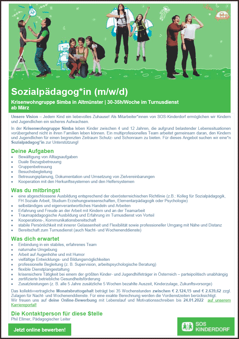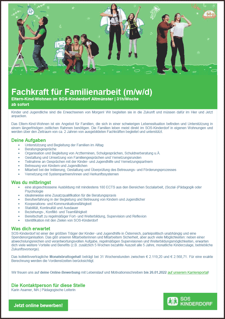 Fachkraft für Familienarbeit (m/w/d) Eltern-Kind-Wohnen im SOS-Kinderdorf Altmünster | 31h/Woche ab sofort