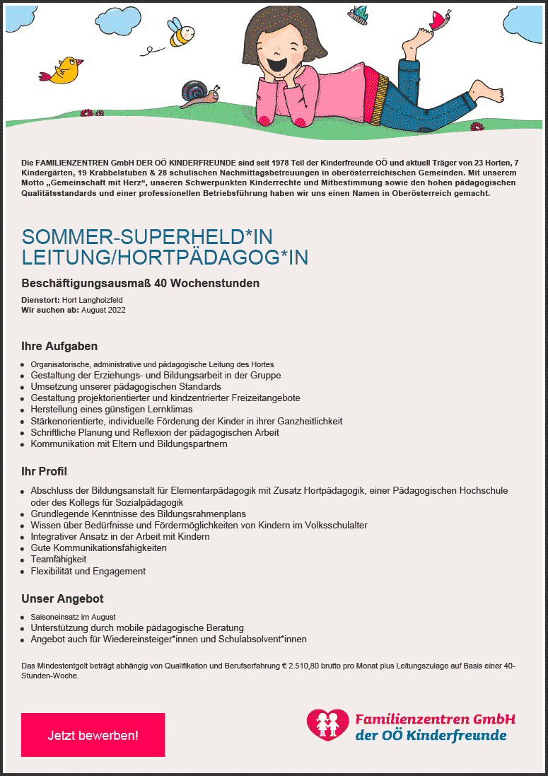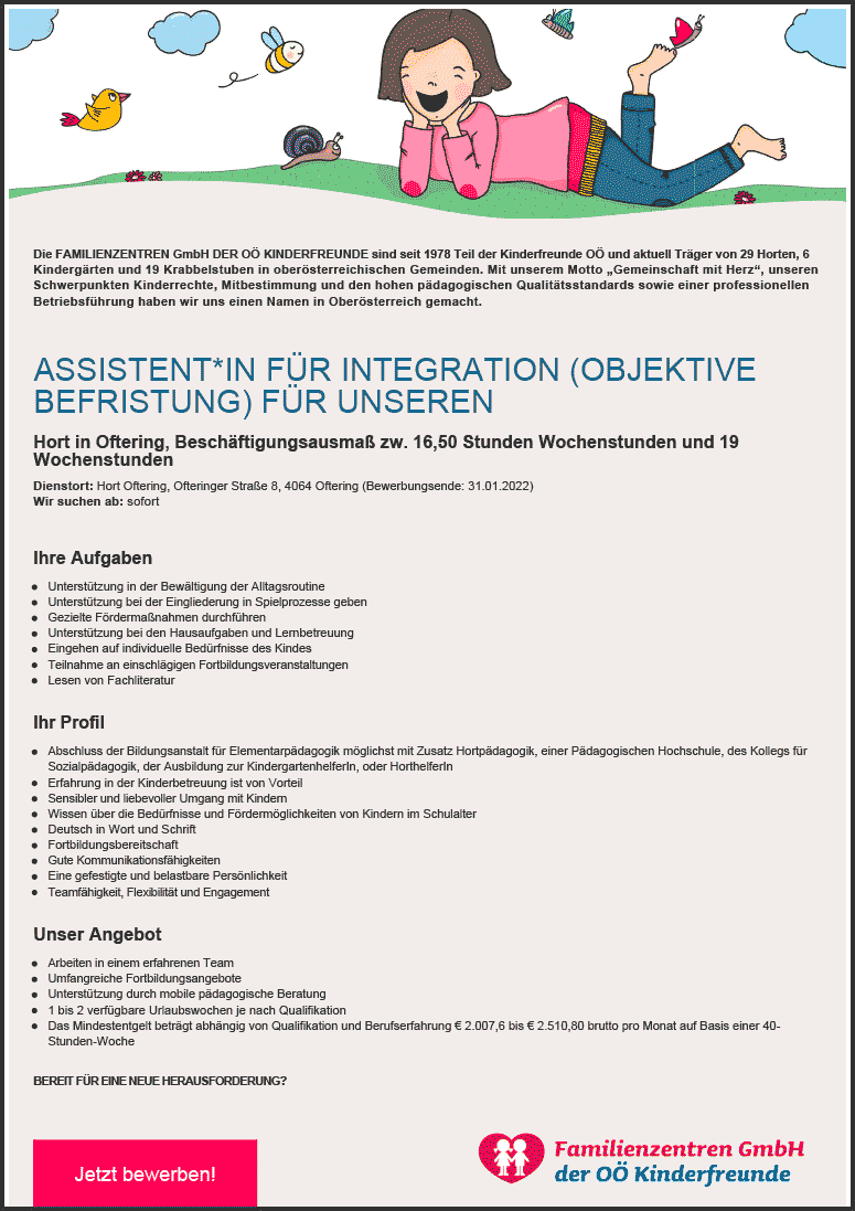 ASSISTENT*IN FÜR INTEGRATION (OBJEKTIVE BEFRISTUNG), Hort in Oftering Beschäftigungsausmaß zw. 16,50 Stunden Wochenstunden und 19 Wochenstunden