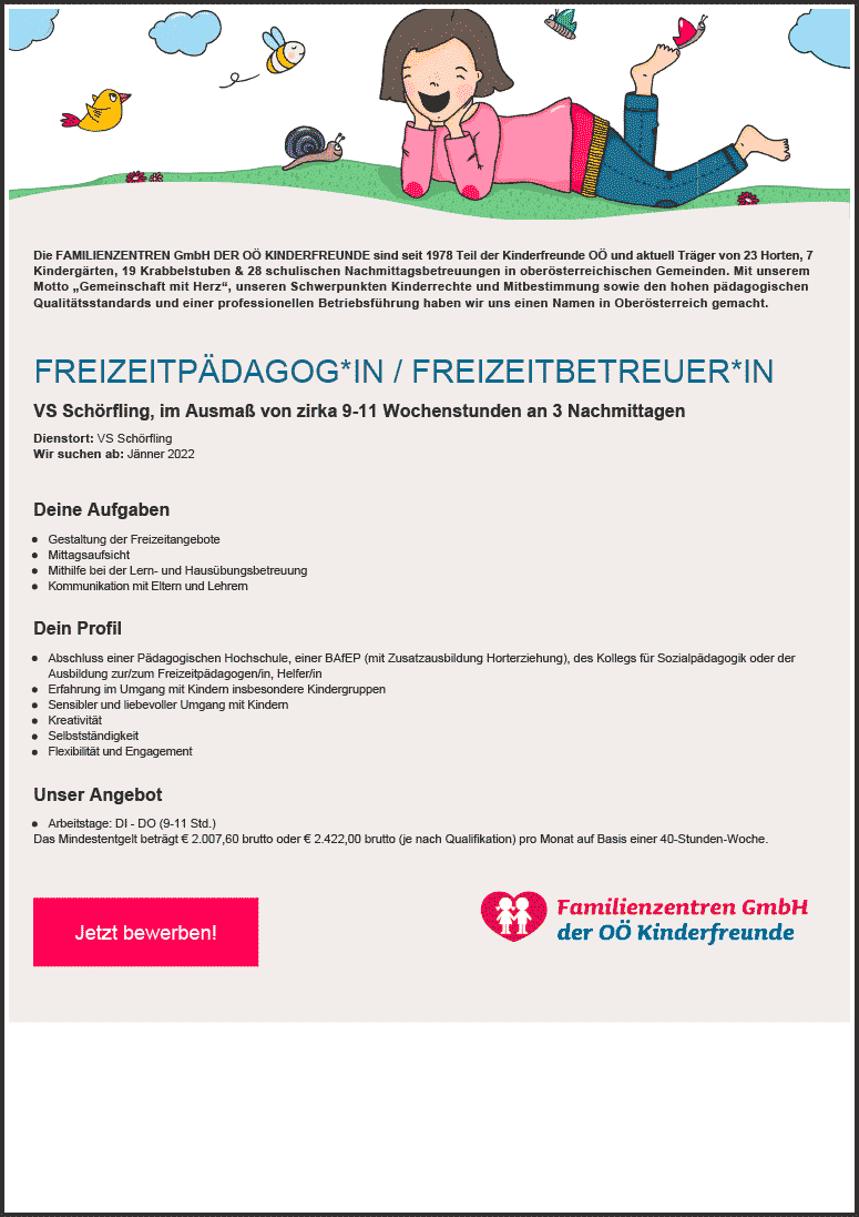FREIZEITPÄDAGOG*IN / FREIZEITBETREUER*IN, VS Schörfling im Ausmaß von zirka 9-11 Wochenstunden an 3 Nachmittagen