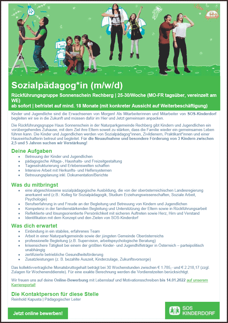 Sozialpädagog*in (m/w/d) Rückführungsgruppe Sonnenschein Rechberg | 25-30/Woche (MO-FR tagsüber, vereinzelt am WE) ab sofort | befristet auf mind. 18 Monate (mit konkreter Aussicht auf Weiterbeschäftigung)