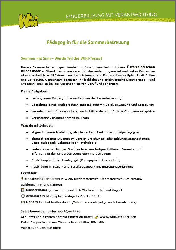 Pädagog:in für die Sommerbetreuung