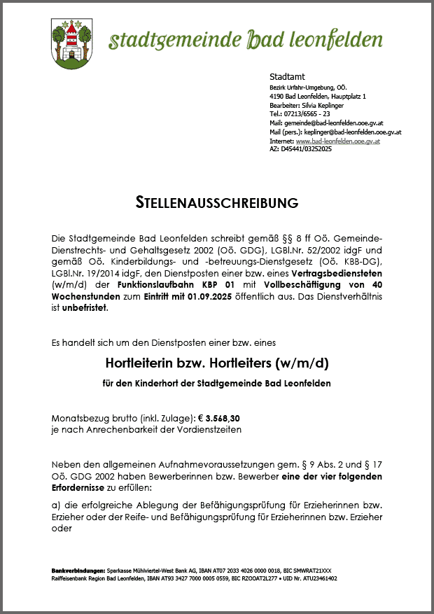 Kinderhort der Stadtgemeinde Bad Leonfelden, Vollbeschäftigung