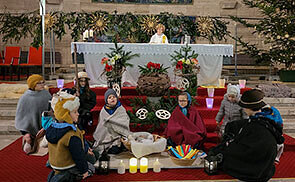 Am 10. März 2024, dem 4. Fastensonntag, trafen viele Kinder zusammen mit ihren Eltern in der Pfarrkirche ein. Nach der herzlichen Begrüßung von Sr. Dominika zogen sie mit dem Licht in den Pfarrsaal. Dort feierten wir gemeinsam einen lebhaften Zwergengottesdienst.