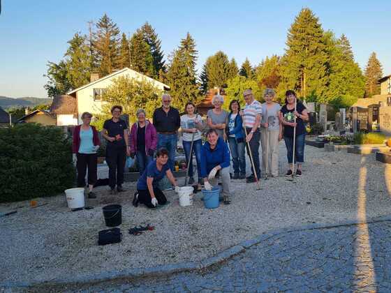 Am Dienstag, 13.5. um 18 Uhr ging es los. Ausgerüstet mit Harken,  Unkrautstechern und Eimern wurde 1 1/2 Stunden das ganz Friedhofsareal durchkämmt und das Unkraut herausgestochen und -gerissen.