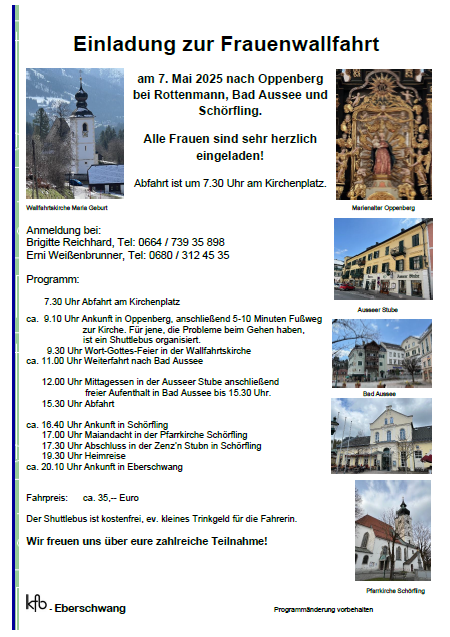 Einladung zur Frauenwallfahrt nach Oppenberg bei Rottenmann und Bad Aussee