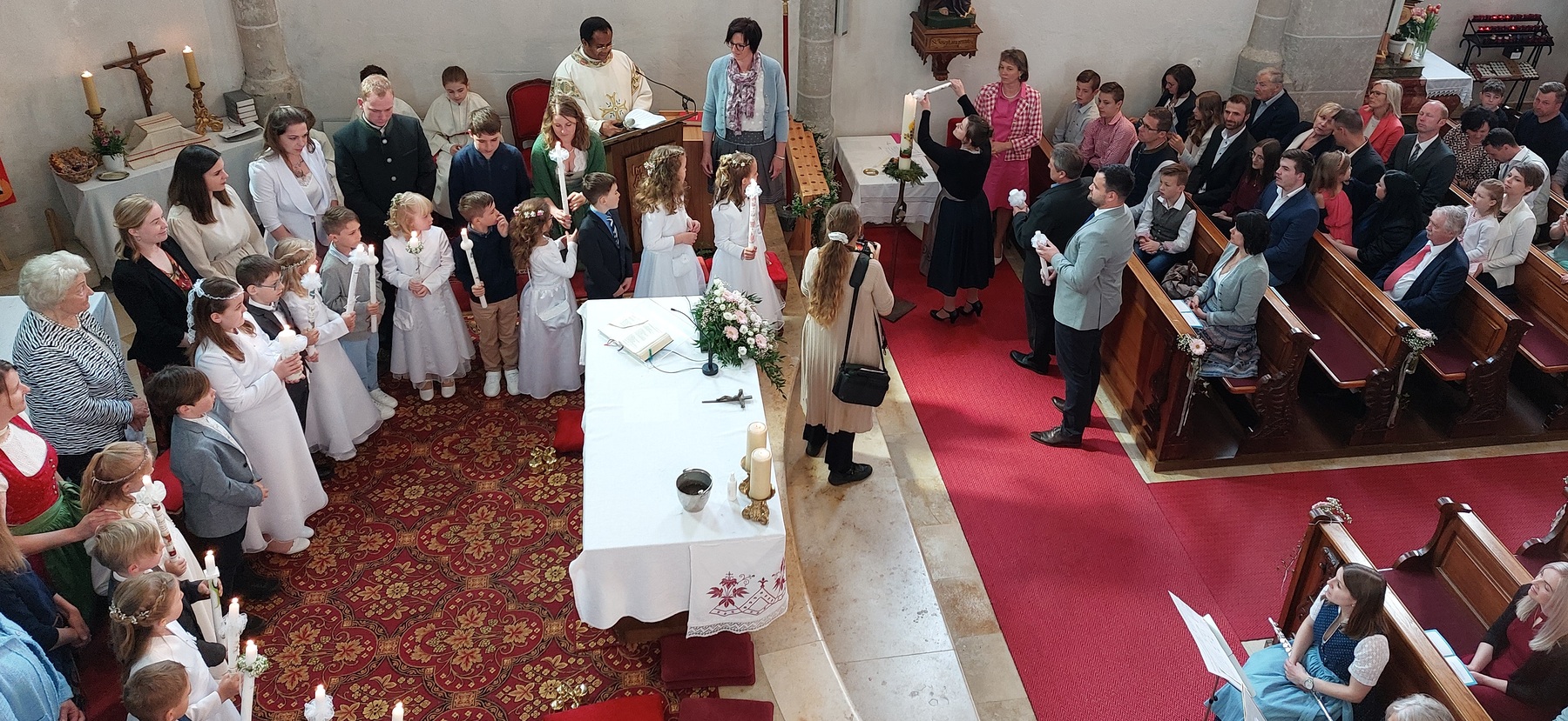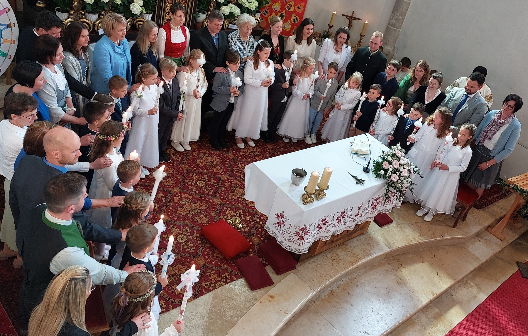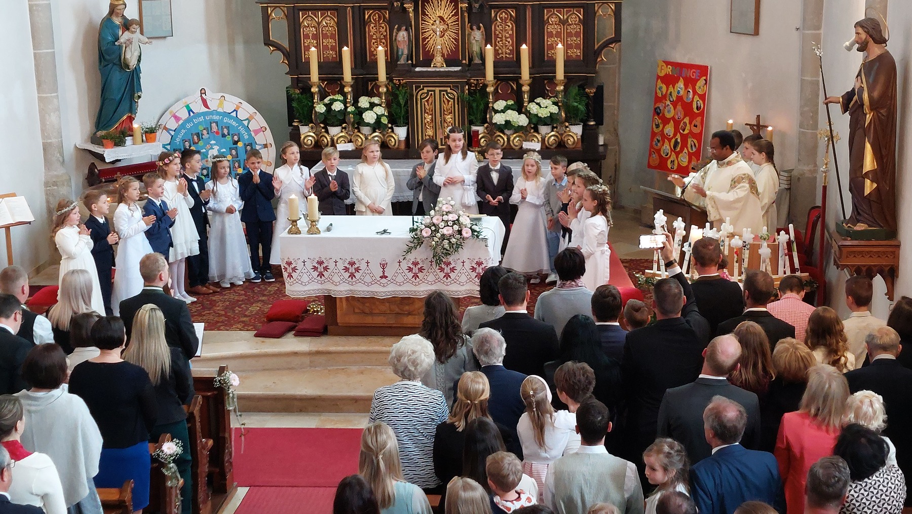 Die Erstkommunionkinder beschäftigten sich heuer mit dem Thema „zum guten Hirten“. Dabei wurden die 22 Kinder von einigen Eltern bei den Tischmutterstunden unterstützt. Es wurden Kerzen verziert, Brot gebacken, über das letzte Abendmahl und die Taufe gesprochen und vieles mehr. Bedanken möchten wir uns bei Religionslehrerin Maria Heller, Klassenlehrerin Franziska Wallner und allen Lehrerinnen der Volksschule. Besonders bedanken wir uns auch bei Philipp Struß für die Weggottesdienste, die sehr interessant gewesen sind.